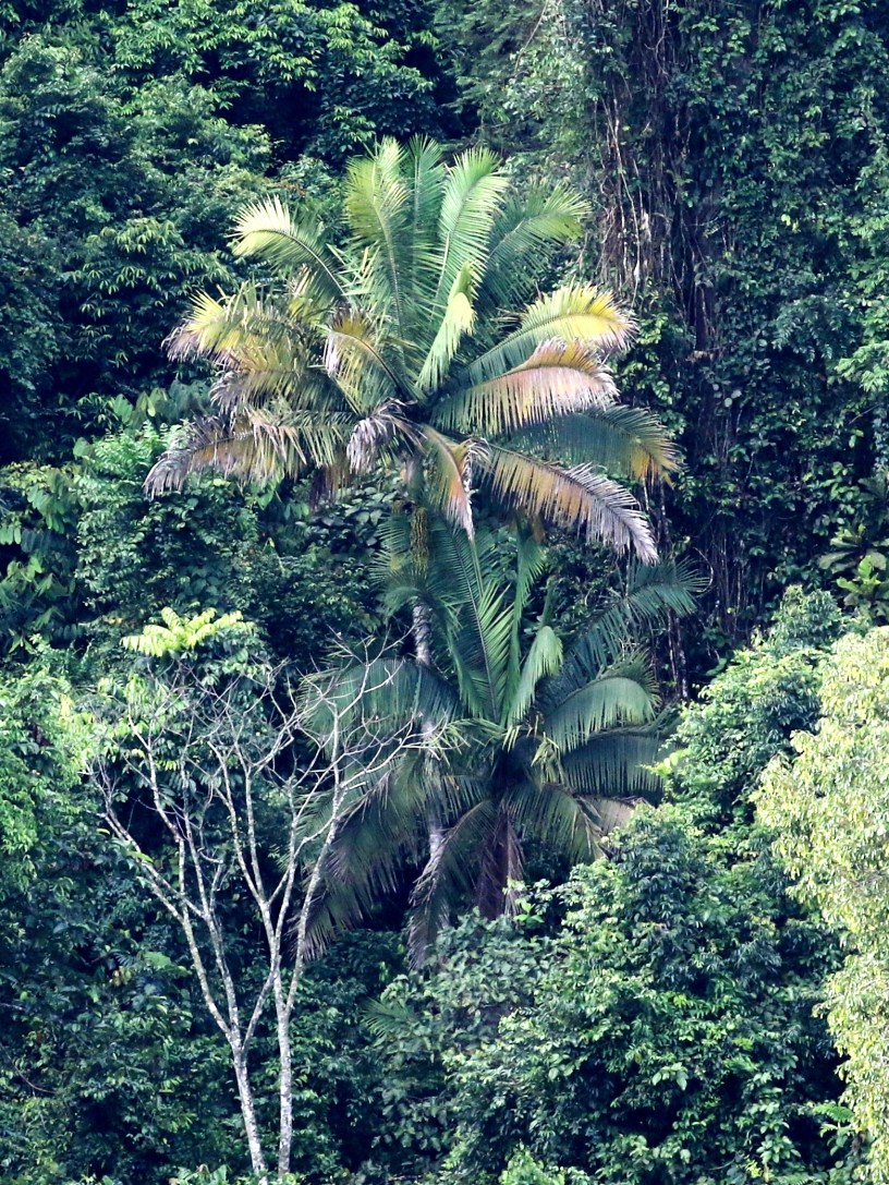 This palm is now rare in many forested areas of Brunei because the growth bud or ubud is harvested to make a delicious green salad by cutting down the whole palm. The trunk of the palm is covered in thick spines to prevent sun bears climbing the palm to eat the bud.