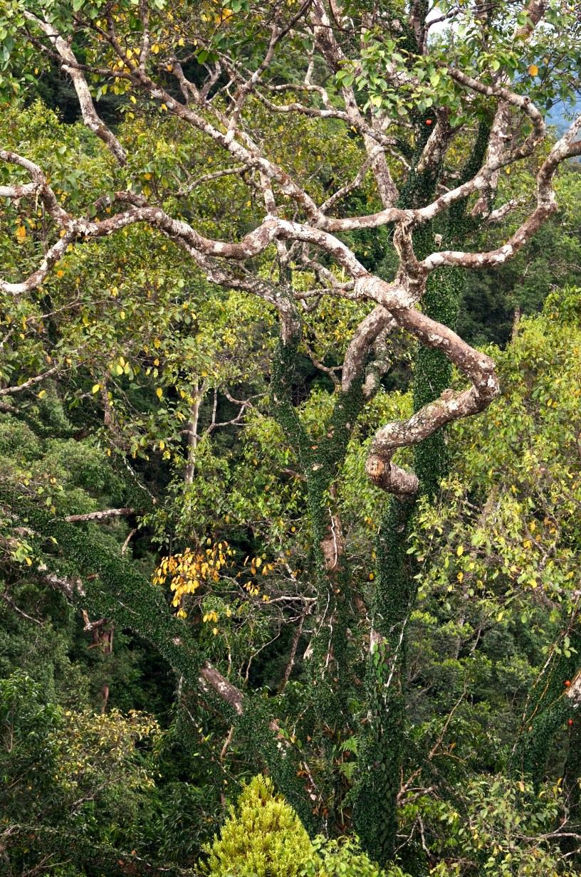 Note that the trunk and branches of this giant dipterocarp are covered in a dense mat of tiny dark green leaves belonging to a Ficus punctata liana which produces giant red fig fig fruit the size of a large orange. See the tiny red dot in the top middle of this photo.